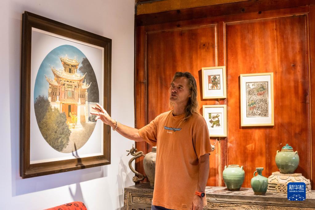 8月27日,林登在喜洲古鎮(zhèn)喜林苑向外國訪客介紹當(dāng)?shù)匚幕P氯A社記者 曹夢瑤 攝