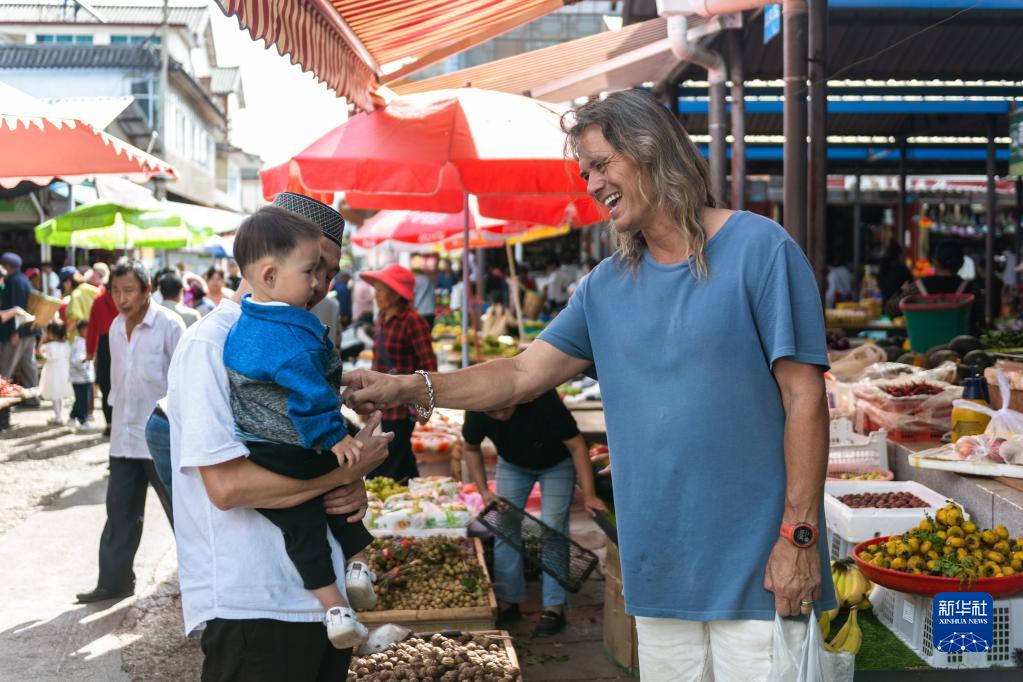 8月28日,林登在喜洲古鎮(zhèn)早市和小朋友打招呼。新華社記者 曹夢瑤 攝
