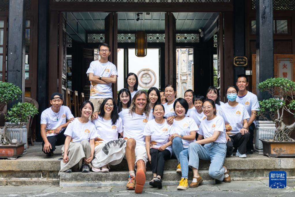 8月28日,林登和妻子瑾妮與喜林苑團(tuán)隊(duì)在云南省喜洲古鎮(zhèn)喜林苑合影。新華社記者 曹夢瑤 攝