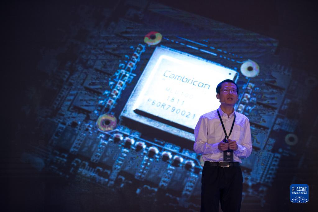 在上海國(guó)際會(huì)議中心舉行的發(fā)布會(huì)上,寒武紀(jì)科技公司首席執(zhí)行官陳天石介紹國(guó)內(nèi)首款云端人工智能芯片(2018年5月3日攝)。新華社記者 金立旺 攝