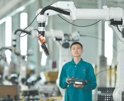 河北省任丘市通過搭建科技創(chuàng)新平臺,建設(shè)研發(fā)中心、技術(shù)研究院,持續(xù)深化產(chǎn)學研合作交流,推動企業(yè)轉(zhuǎn)型升級。圖為工作人員在生產(chǎn)車間調(diào)試機器人。 |