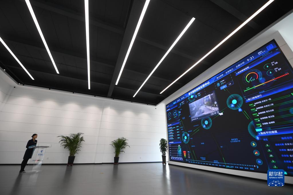 10月16日,河北雄安新區(qū)中國電信智慧城市產(chǎn)業(yè)園工作人員展示數(shù)字道路運營系統(tǒng)。新華社記者 朱旭東 攝