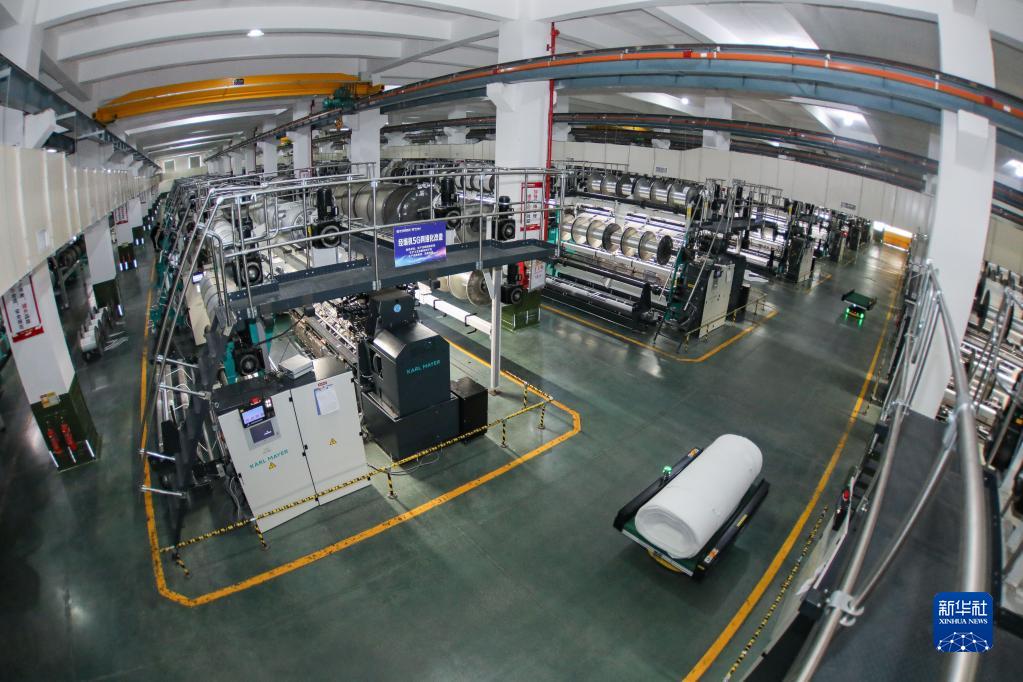 福建晉江,華宇錚鎣集團(tuán)第五經(jīng)編車間內(nèi),一排排經(jīng)編機正在高速運轉(zhuǎn),AGV物流機器人不停穿梭其中。