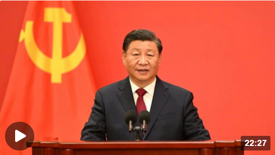 在中國共產黨第二十屆中央委員會第一次全體會議上當選的中共中央總書記習近平和中共中央政治局常委李強、趙樂際、王滬寧、蔡奇、丁薛祥、李希,23日中午在人民大會堂同采訪中共二十大的中外記者見面。習近平發(fā)表重要講話。
