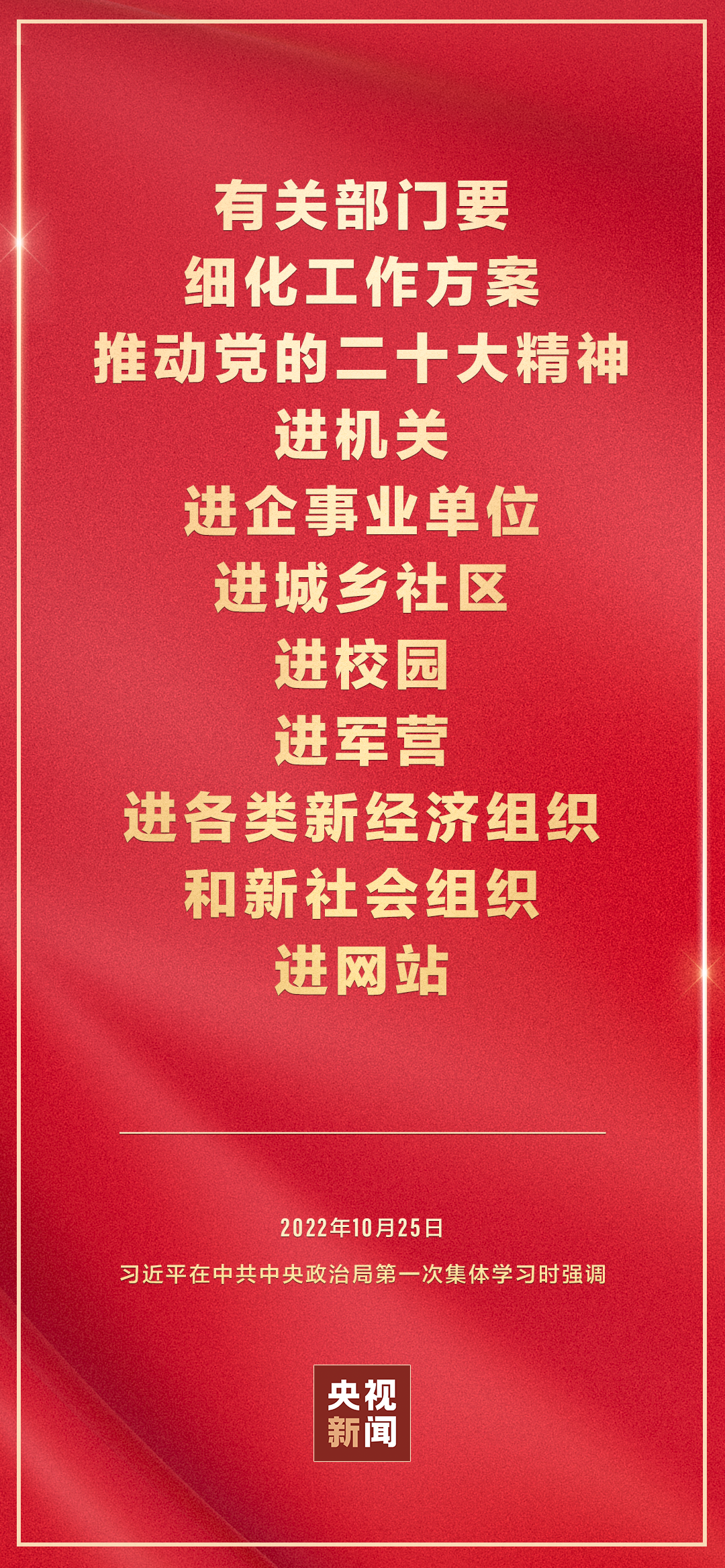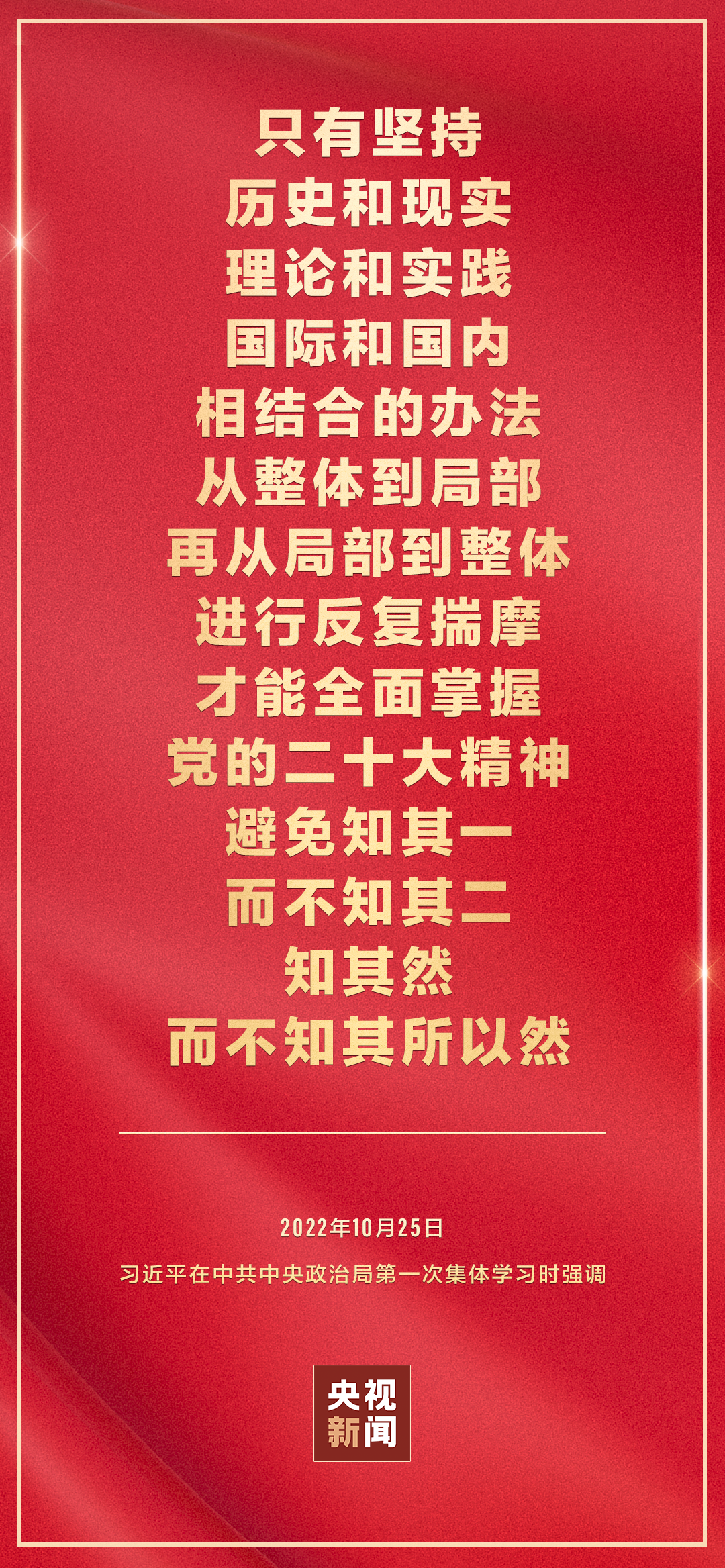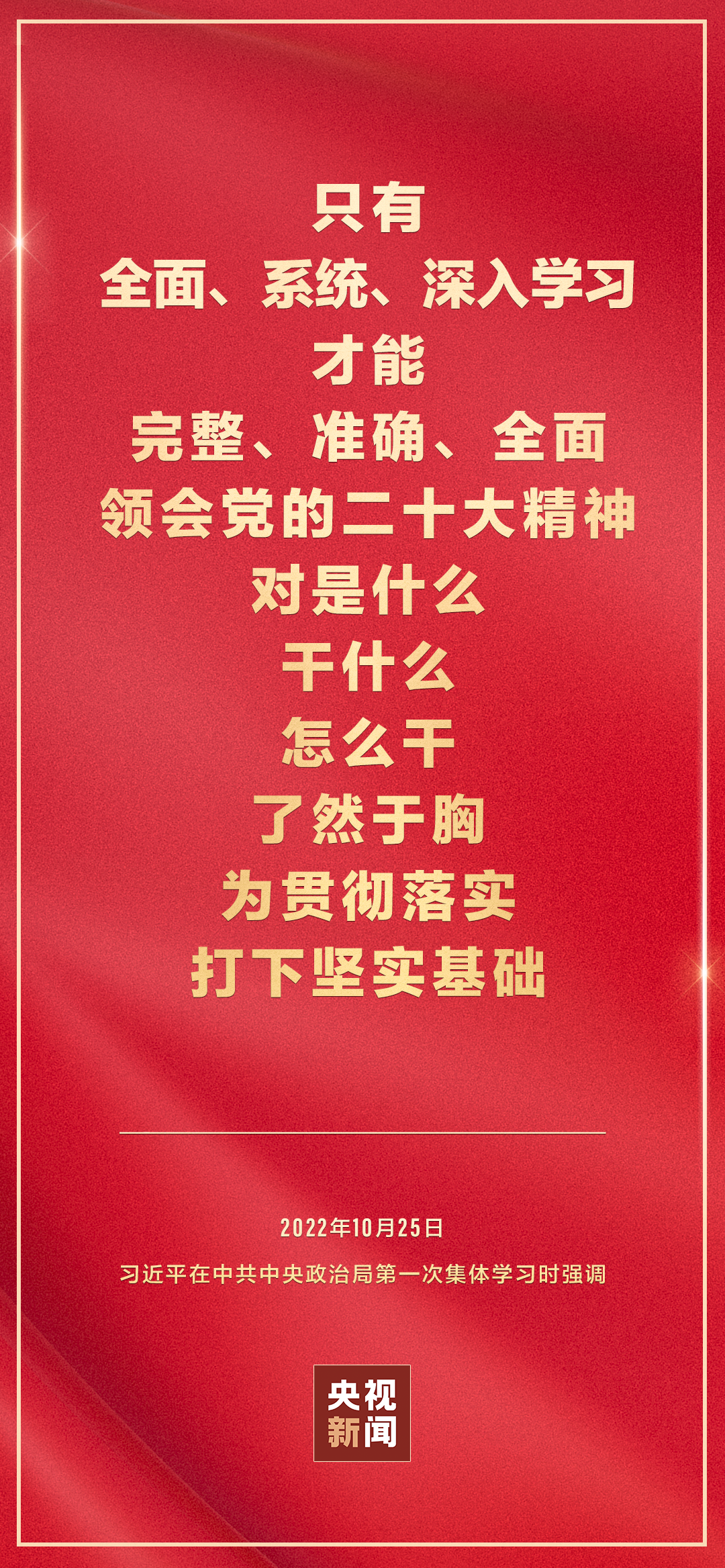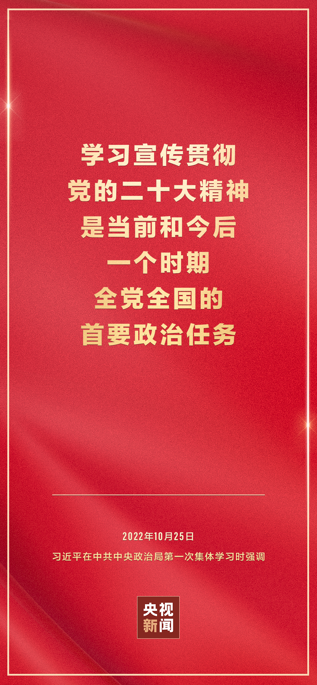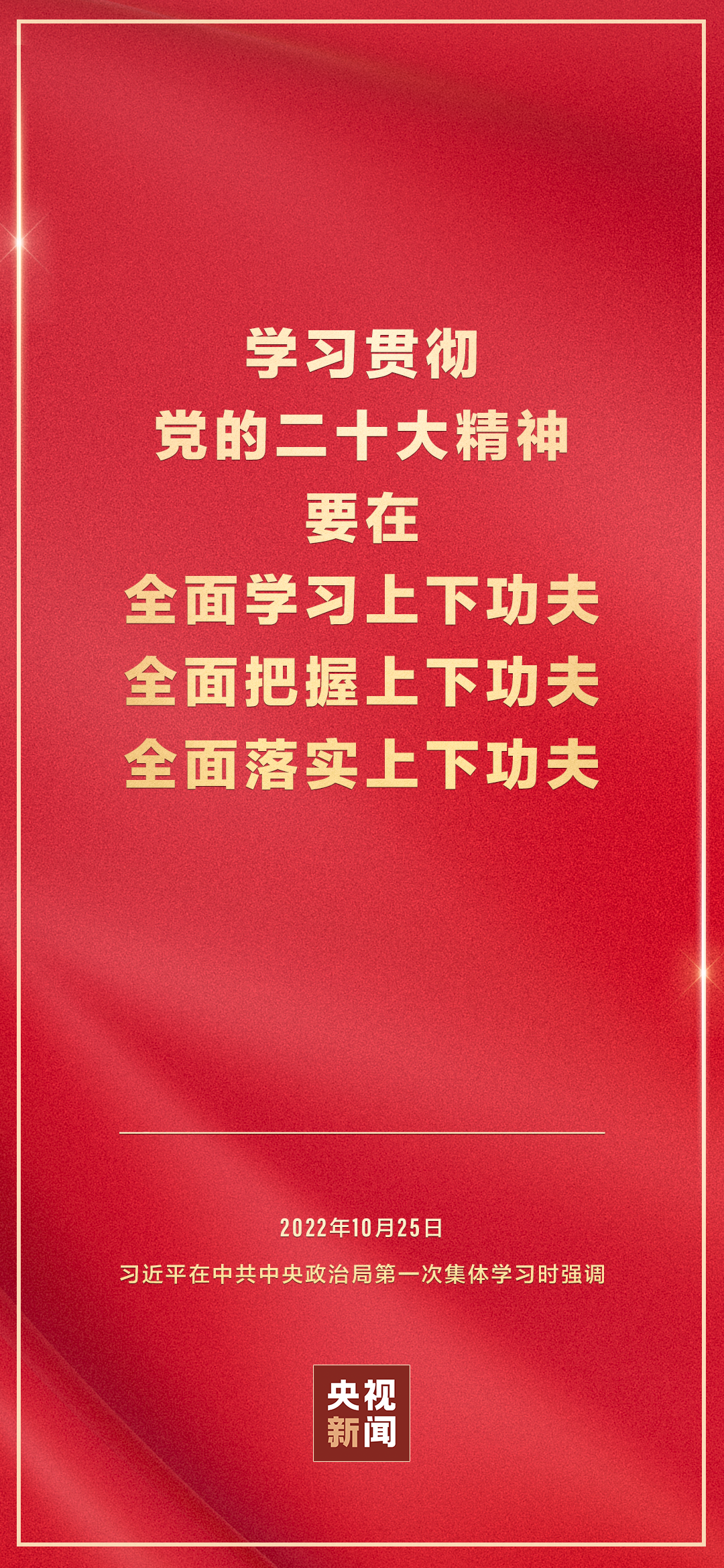 二十屆中共中央政治局10月25日下午就學(xué)習(xí)貫徹黨的二十大精神進行第一次集體學(xué)習(xí)。中共中央總書記習(xí)近平在主持學(xué)習(xí)時強調(diào),全黨要在全面學(xué)習(xí)、全面把握、全面落實上下功夫,堅定不移把黨的二十大提出的目標任務(wù)落到實處,奮力奪取全面建設(shè)社會主義現(xiàn)代化國家新勝利。