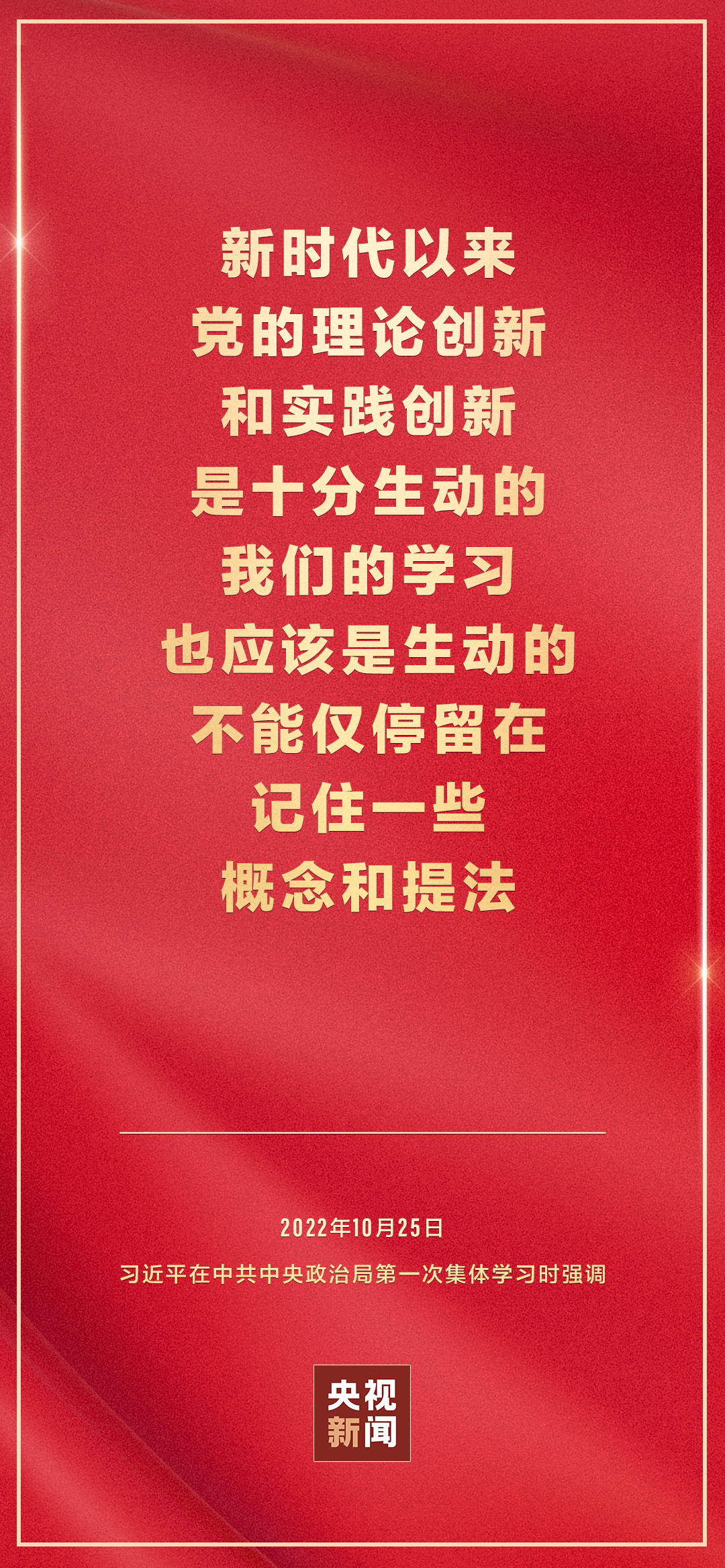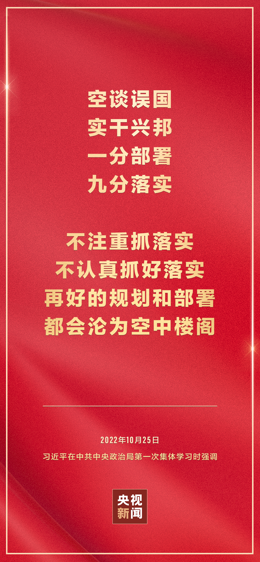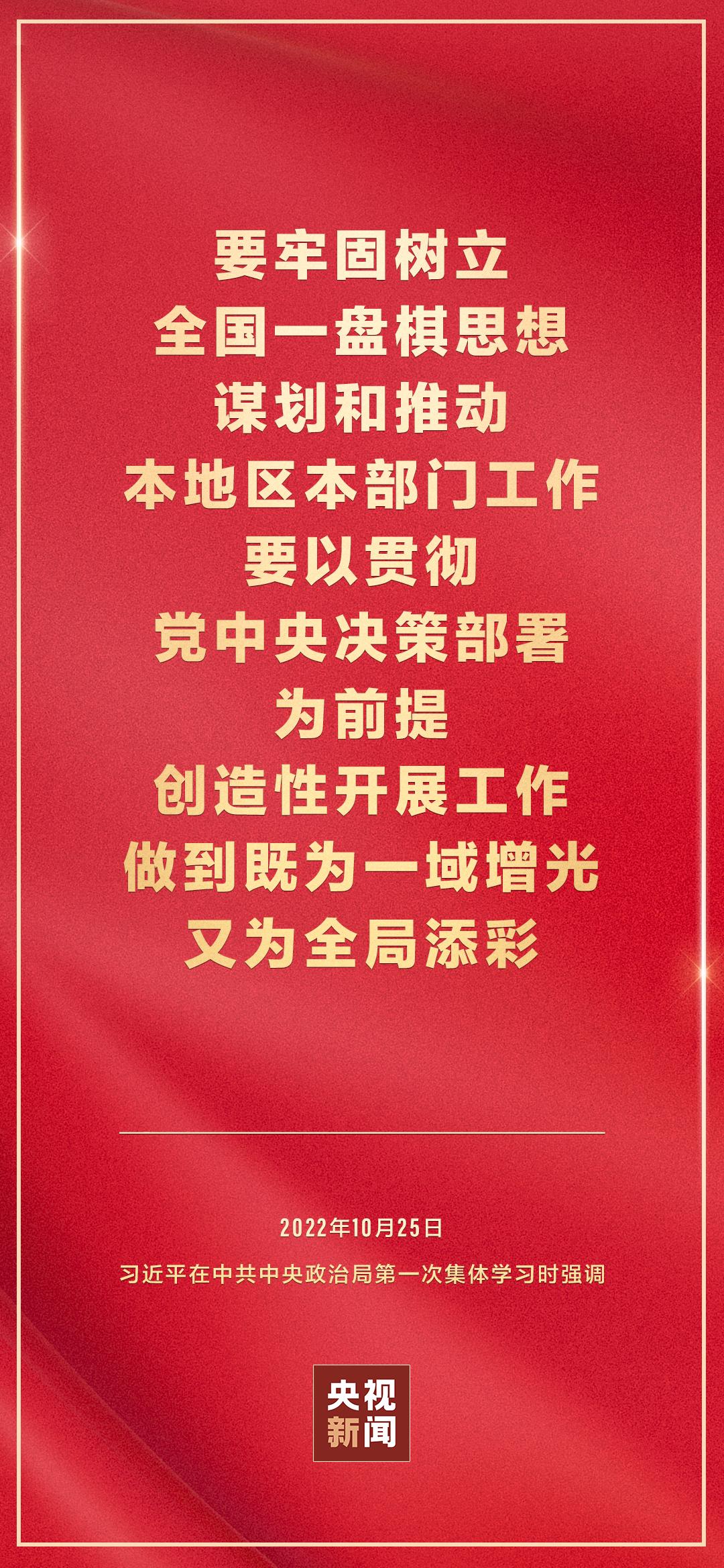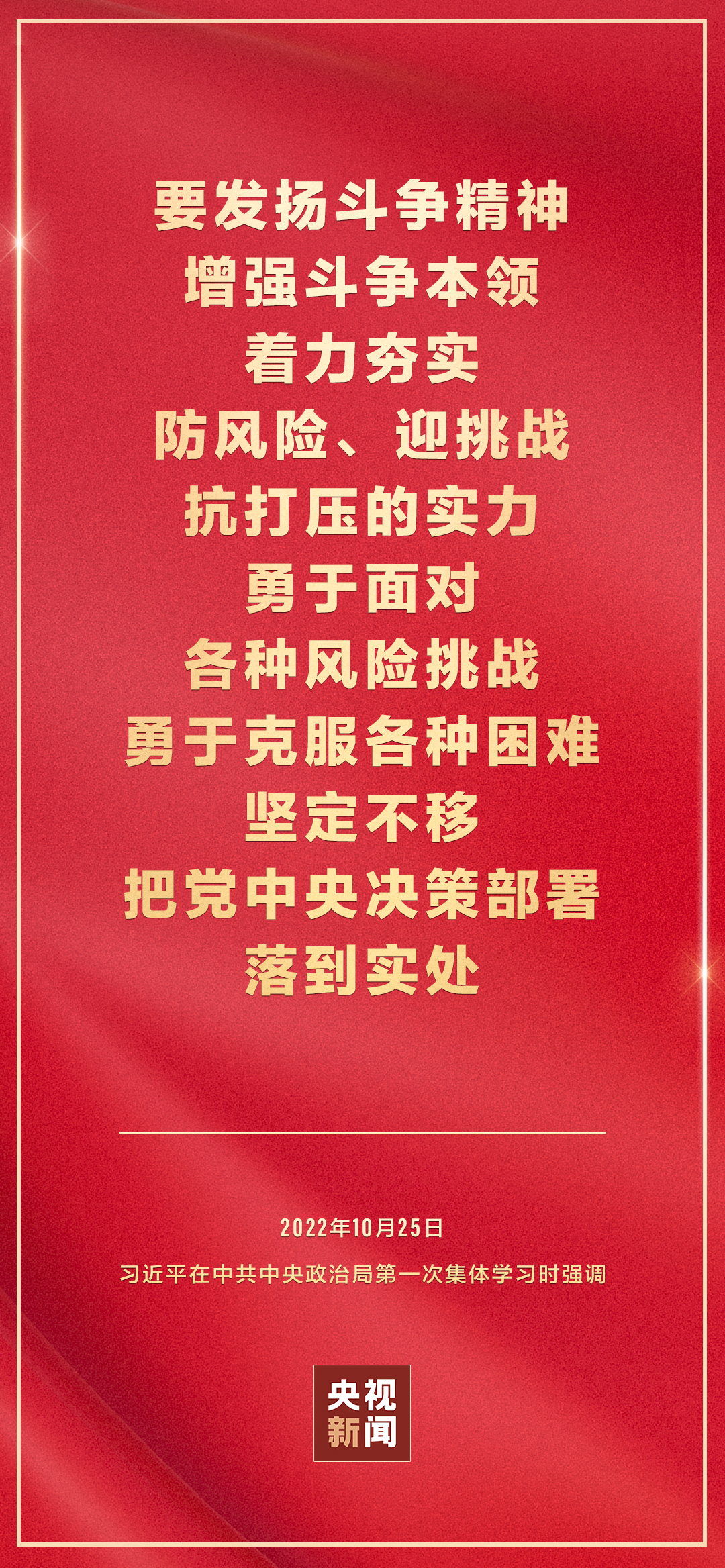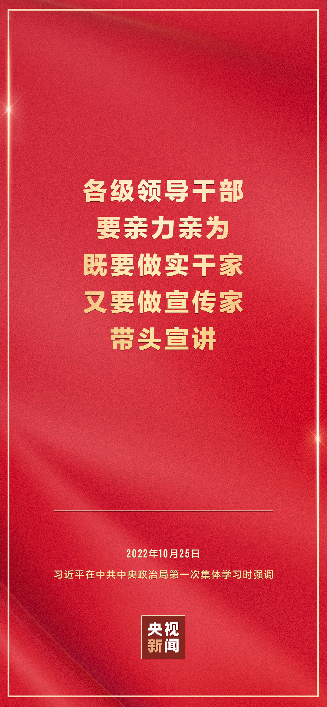 二十屆中共中央政治局10月25日下午就學(xué)習(xí)貫徹黨的二十大精神進行第一次集體學(xué)習(xí)。中共中央總書記習(xí)近平在主持學(xué)習(xí)時強調(diào),全黨要在全面學(xué)習(xí)、全面把握、全面落實上下功夫,堅定不移把黨的二十大提出的目標任務(wù)落到實處,奮力奪取全面建設(shè)社會主義現(xiàn)代化國家新勝利。