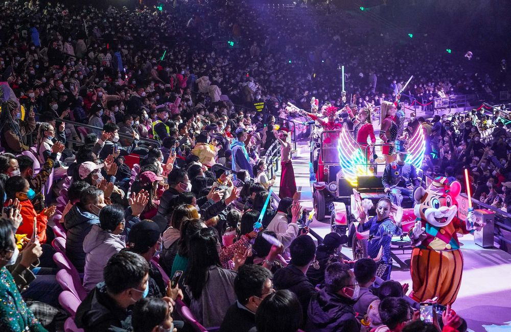 游客在廣州長(zhǎng)隆旅游度假區(qū)游園看馬戲迎接新年。新華社記者 劉大偉 攝