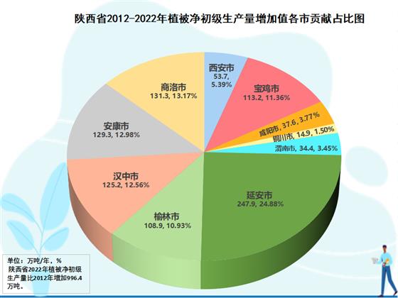 2012-2022年分市元生產(chǎn)量增長(zhǎng)貢獻(xiàn)分析結(jié)果表明,各市對(duì)全省生態(tài)蛋糕增長(zhǎng)均有所貢獻(xiàn),但各市的貢獻(xiàn)大小差異很大,在生態(tài)蛋糕中的地位也隨之有所變化。全國(guó)退耕還林策源地美稱的延安是全省生態(tài)蛋糕增量最大的市,10年增加247.9萬(wàn)噸,為全省生態(tài)蛋糕增加量貢獻(xiàn)了24.9個(gè)百分點(diǎn)。商洛第二,10年增加131.3萬(wàn)噸,為全省貢獻(xiàn)13.2個(gè)百分點(diǎn)。安康第三,10年增加129.3萬(wàn)噸,為全省貢獻(xiàn)13.0個(gè)百分點(diǎn)。漢中第四,增加125.2萬(wàn)噸,為全省貢獻(xiàn)12.6個(gè)百分點(diǎn)。其后,依次分別是寶雞增加113.2萬(wàn)噸、為全省貢獻(xiàn)11.4%,榆林增加108.9萬(wàn)噸、為全省貢獻(xiàn)10.9%,西安增加53.7萬(wàn)噸、為全省貢獻(xiàn)5.4%,咸陽(yáng)增加37.6萬(wàn)噸、為全省貢獻(xiàn)3.8%,渭南增加34.4萬(wàn)噸、為全省貢獻(xiàn)3.4%,銅川增加24.9萬(wàn)噸、為全省貢獻(xiàn)1.5%。