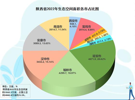 陜西南部秦巴山脈、北部黃土高原、中部渭河川地,自然生態(tài)空間多、占比大。陜西省生態(tài)空間數(shù)據(jù)中心提供的數(shù)據(jù)顯示,全省國(guó)土空間3.08億畝,其中生態(tài)空間(林地、草地、濕地、荒野)2.26億畝。從全省10市生態(tài)空間大格局分析觀察,黃土高原腹地的延安是全省生態(tài)空間第一市,生態(tài)空間4671.9萬(wàn)畝、占本市國(guó)土空間84.1%、占全省生態(tài)空間20.6%。長(zhǎng)城內(nèi)外、林草過度的榆林居第二,生態(tài)空間4299.7萬(wàn)畝、占本市國(guó)土空間66.8%、占全省生態(tài)空間19.0%。第三是漢中,生態(tài)空間3432.2萬(wàn)畝、占本市國(guó)土空間84.4%、占全省生態(tài)空間15.1%。第四是安康,生態(tài)空間3089.3萬(wàn)畝、占本市國(guó)土空間87.5%、占全省生態(tài)空間13.6%。其后,依次分別是商洛,生態(tài)空間2614.7萬(wàn)畝、占本市國(guó)土空間90.0%、占全省生態(tài)空間11.5%,寶雞2014.4萬(wàn)畝、占本市74.1%、占全省8.9%,西安948.1萬(wàn)畝、占本市62.6%、占全省4.2%,渭南617.4萬(wàn)畝、占本市31.5%、占全省2.7%,咸陽(yáng)612萬(wàn)畝、占本市39.5%、占全省2.7%,銅川362.5萬(wàn)畝、占本市62.2%、占全省1.6%。