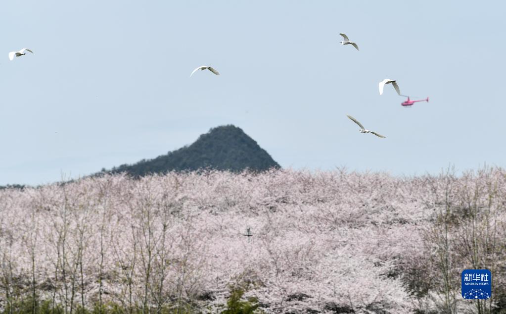 3月21日,一群鳥在貴州省貴安新區(qū)櫻花園內飛翔。新華社記者 楊文斌 攝