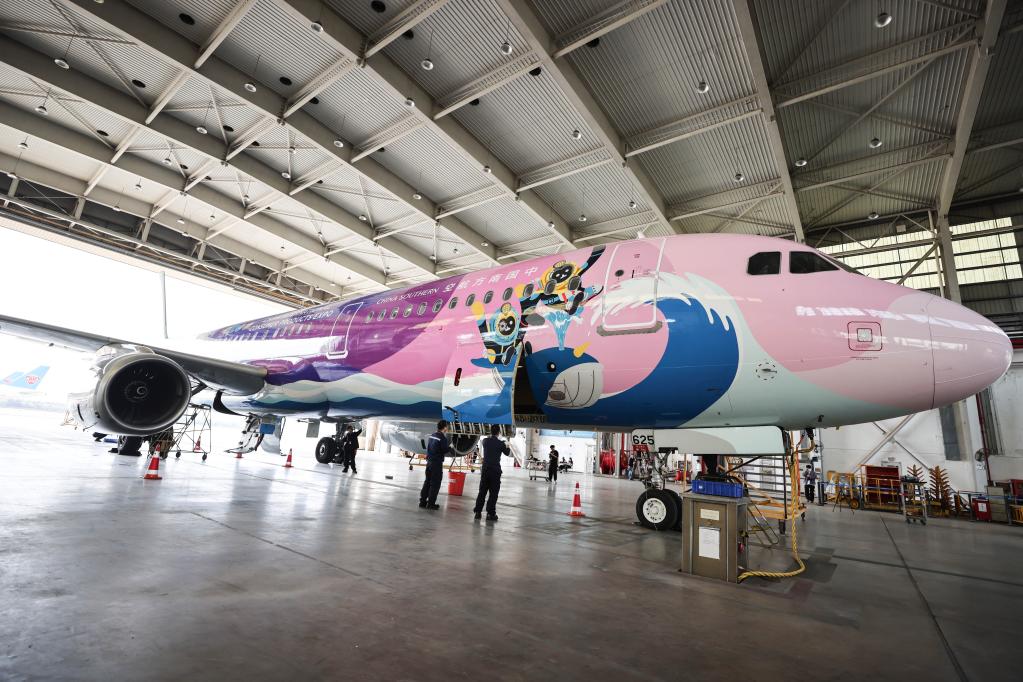 2023年3月7日,在海口美蘭國(guó)際機(jī)場(chǎng),南航機(jī)務(wù)人員對(duì)“消博號(hào)”彩繪飛機(jī)進(jìn)行深度檢查。新華社記者 張麗蕓 攝