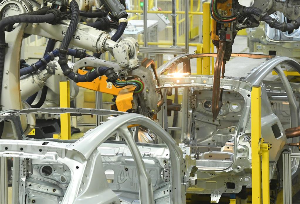 4月11日,智能機(jī)器人在領(lǐng)克汽車(chē)寧波余姚工廠(chǎng)焊裝車(chē)間工作。新華社記者翁忻旸 攝