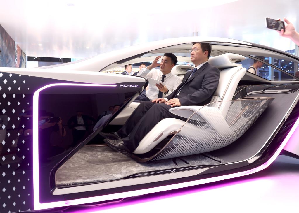 4月18日,觀(guān)眾在上海車(chē)展一汽展臺(tái)體驗(yàn)智能座艙。新華社記者陳建力 攝
