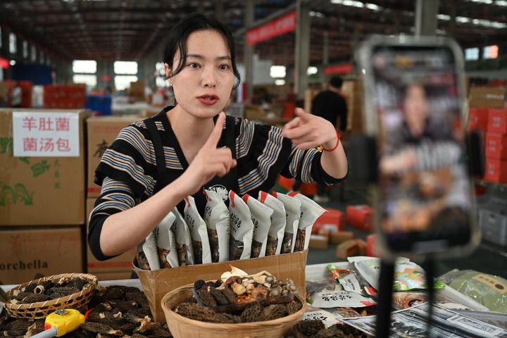 福建省寧德市近年來加大電商人才培育,推動(dòng)鄉(xiāng)村振興和經(jīng)濟(jì)高質(zhì)量發(fā)展。圖為不久前的一處農(nóng)產(chǎn)品深精加工車間內(nèi),當(dāng)?shù)匾幻娚讨鞑フ诮榻B羊肚菌產(chǎn)品。新華社記者 林善傳攝