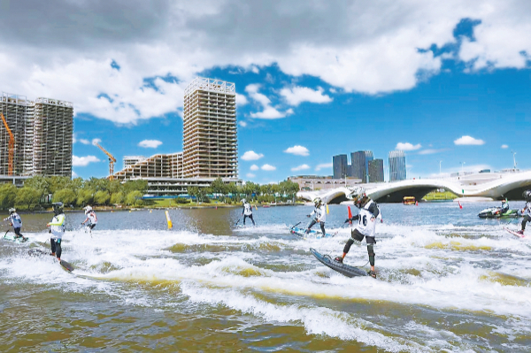 今年7月,2023年全國電動沖浪板聯(lián)賽(北京大運河站)在北運河開賽,這也是副中心在大運河首次承辦國家級動力板聯(lián)賽?;顒蝇F(xiàn)場,參賽運動員在風景如畫的大運河上踏浪飛馳,吶喊聲、歡呼聲在河兩岸此起彼伏,飛濺的浪花、激情的運動、歡樂的人群,共同構成了一幅炫彩、活力的運河新圖景。