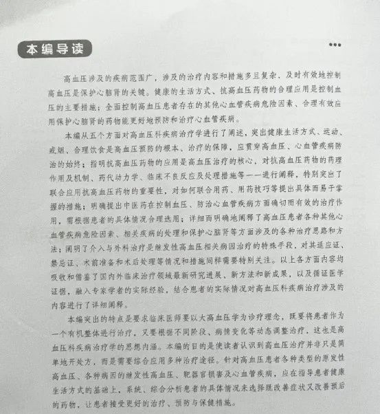 該書每一編都有一個導讀,指導讀者怎樣學習使用相關(guān)內(nèi)容,在閱讀每編、章、節(jié)前都能構(gòu)建好系統(tǒng)的理論知識框架,順利把握好各章節(jié)中的重點、難點及疑點,更好地汲取書中的教學方法及研究成果。如第四編“高血壓科疾病治療學”從健康生活方式、抗高血壓藥物、中醫(yī)藥、相關(guān)疾病處理和介入與外科手術(shù)等五個方面對高血壓科疾病治療學進行了闡述。反映了高血壓涉及的疾病范圍廣,涉及的治療內(nèi)容和措施多且復雜,及時有效地控制高血壓是保護心腦腎的關(guān)鍵。健康的生活方式、抗高血壓藥物的合理應用是控制血壓的主要措施;全面控制高血壓患者存在的其他心血管疾病危險因素、合理有效應用保護心腦腎的藥物能更好地預防和治療心血管疾病。