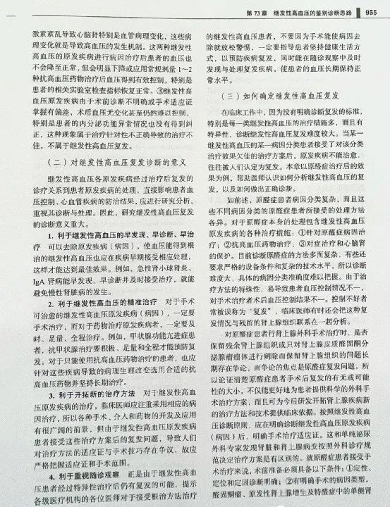 本書提出了繼發(fā)性高血壓復發(fā)的概念:繼發(fā)性高血壓在接受有效處理方法后達到了治愈效果者,在某種誘因作用下,再次出現(xiàn)該疾病病理與病理生理改變及由此產(chǎn)生臨床表現(xiàn)和相關(guān)實驗室檢查結(jié)果異常,這就表明繼發(fā)性高血壓復發(fā)。讓人們清晰地認識到對于繼發(fā)性高血壓復發(fā)診斷的意義:①利于繼發(fā)性高血壓的早發(fā)現(xiàn)、早診斷、早治療;②利于繼發(fā)性高血壓的精準治療;③利于認識和評價新的診療方法開拓的價值和意義;④利于重視繼發(fā)性高血壓患者的隨診觀察。