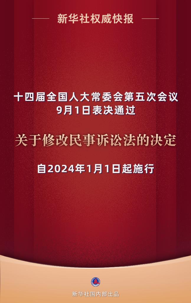 9月1日,十四屆全國人大常委會第五次會議表決通過關于修改民事訴訟法的決定,自2024年1月1日起施行。