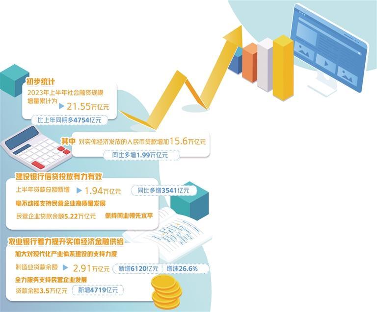 今年上半年以來,金融持續(xù)支持實(shí)體經(jīng)濟(jì)恢復(fù)發(fā)展和回升向好,金融體系對(duì)實(shí)體經(jīng)濟(jì)的支持進(jìn)一步加大。初步統(tǒng)計(jì),2023年上半年社會(huì)融資規(guī)模增量累計(jì)為21.55萬億元,比上年同期多4754億元。其中,對(duì)實(shí)體經(jīng)濟(jì)發(fā)放的人民幣貸款增加15.6萬億元,同比多增1.99萬億元。
