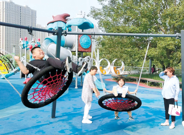初秋,在亦莊涼水河公園,孩子們暢玩輪胎秋千。近年來(lái),本市不少公園經(jīng)過(guò)改造提升,新增了滑索、繩網(wǎng)等新設(shè)施,變得更加“兒童友好”。 記者 甘南攝