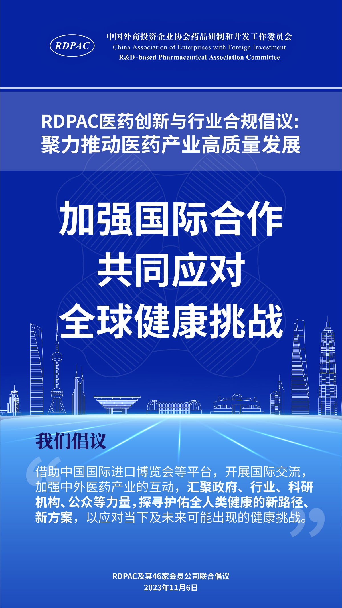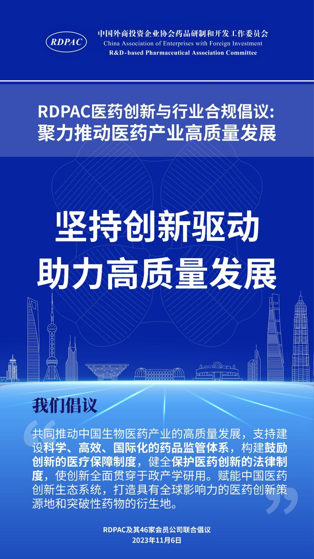 11月6日,中國(guó)外商投資企業(yè)協(xié)會(huì)藥品研制和開(kāi)發(fā)工作委員會(huì) (以下簡(jiǎn)稱 “RDPAC”)及其成員公司在華負(fù)責(zé)人共同發(fā)起“RDPAC醫(yī)藥創(chuàng)新與行業(yè)合規(guī)倡議”,致力于打造充滿活力的醫(yī)藥創(chuàng)新生態(tài)系統(tǒng)、完善的行業(yè)合規(guī)體系,聚力推動(dòng)中國(guó)醫(yī)藥產(chǎn)業(yè)的高質(zhì)量發(fā)展,建設(shè)健康中國(guó)。