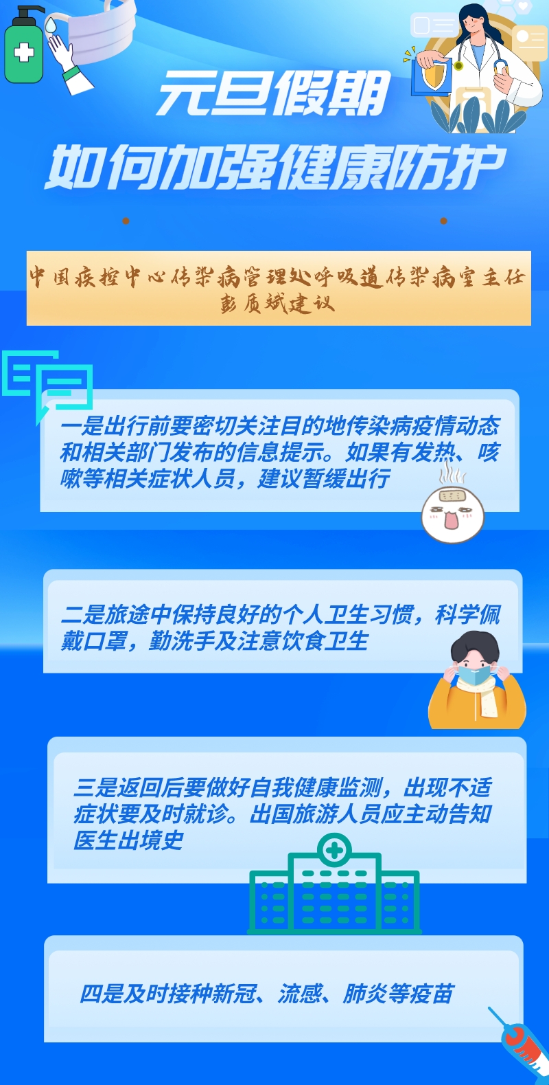 元旦假期中,人員流動增多,探親訪友、旅游出行、聚會聚餐等增加,呼吸道疾病傳播風(fēng)險加大,做好健康防護(hù)至關(guān)重要。