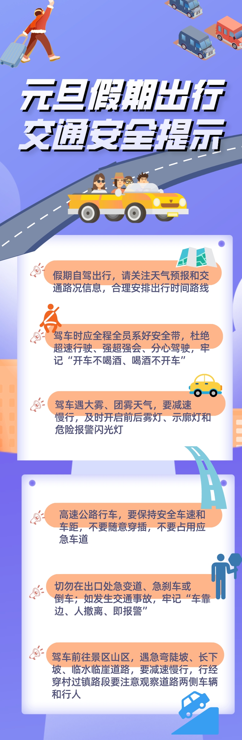 公安部結(jié)合近三年元旦假期道路交通出行和交通事故規(guī)律特點(diǎn),分析研判2024年元旦假期道路交通安全形勢。據(jù)研判,元旦假期旅游客運(yùn)安全風(fēng)險突出,跨年賀歲活動多,溫泉游、滑雪游、農(nóng)家樂等旅游出行頻繁,多家在線旅游平臺元旦假期旅游訂單量同比增長超3倍,旅游客運(yùn)、公路客運(yùn)、自駕車超員載客、超速行駛等違法肇事易發(fā)多發(fā)。