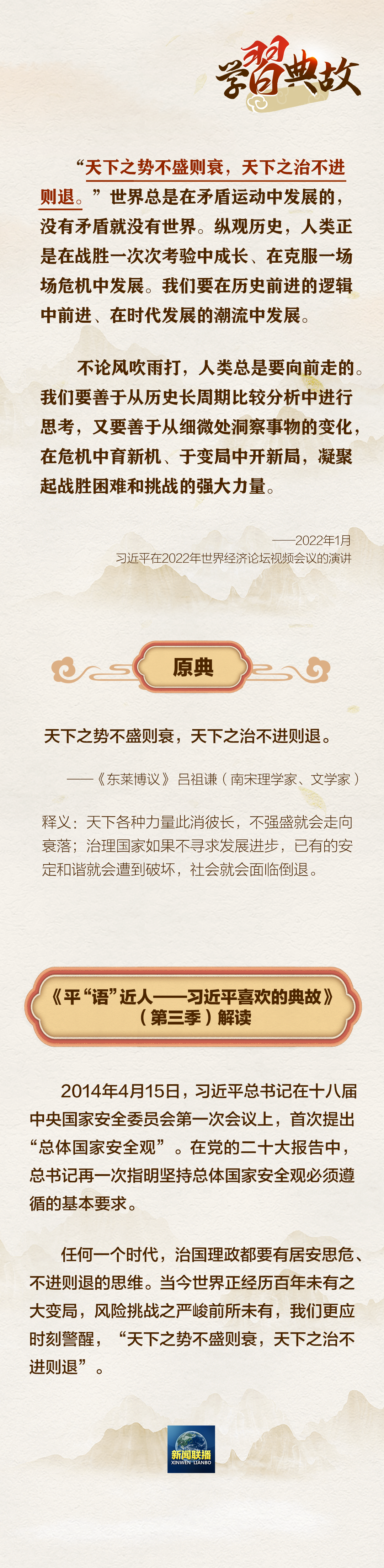 黨的二十大報(bào)告中,習(xí)近平總書記指出,國家安全是民族復(fù)興的根基,社會(huì)穩(wěn)定是國家強(qiáng)盛的前提。必須堅(jiān)定不移貫徹總體國家安全觀,把維護(hù)國家安全貫穿黨和國家工作各方面全過程,確保國家安全和社會(huì)穩(wěn)定。圍繞“國家安全”這一主題,總書記曾講到哪些典故?一起學(xué)習(xí)↓↓↓