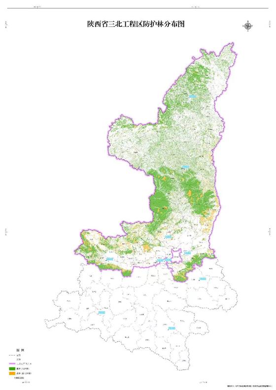 “三北工程”是“防護(hù)林”工程,也是中國生態(tài)文明建設(shè)的重要標(biāo)志性工程。1978年11月25日,國務(wù)院批準(zhǔn)實(shí)施三北防護(hù)林體系建設(shè)工程(簡稱“三北工程”),規(guī)劃期由1978年到2050年,規(guī)劃區(qū)總面積65億畝。“三北工程”是人類最具雄心的生態(tài)工程。陜西是“三北工程”之省,秦嶺以北的黃河流域,包括秦嶺北麓、關(guān)中平原、渭北旱塬、丘陵溝壑、毛烏素沙地,皆是“三北工程”區(qū)。陜西“三北工程”區(qū)總面積1.83億畝,占全省土地面積的59.29%、占全國“三北工程”區(qū)面積的2.8%。